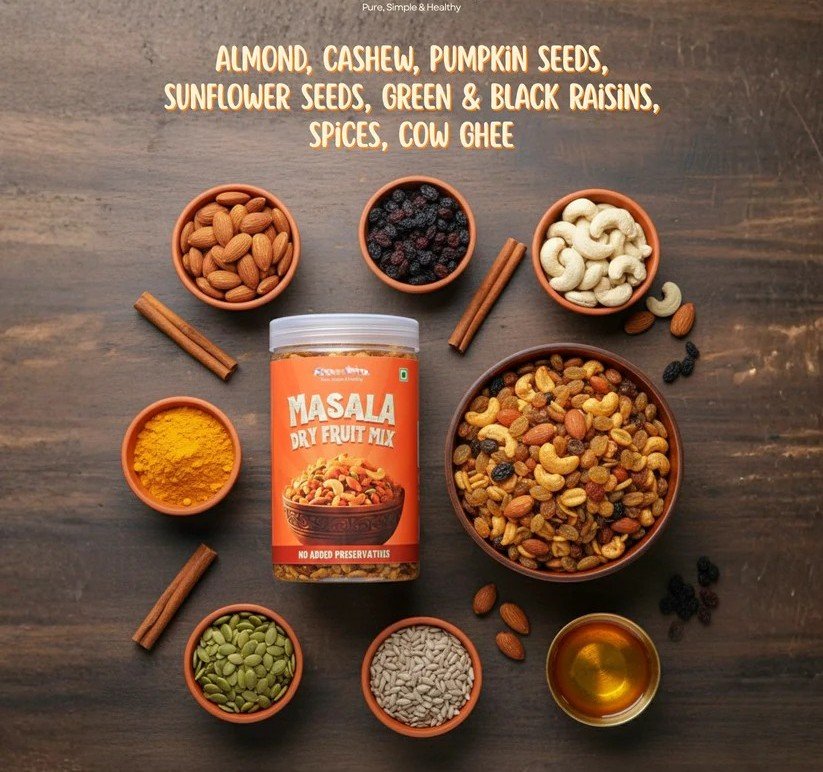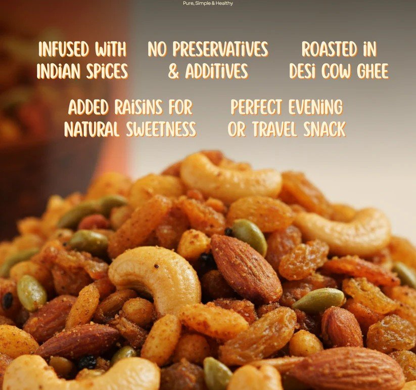 Slow-roasted in cow ghee and seasoned with our signature masala, this mix delivers authentic flavour with pure nourishment — making snacking genuinely enjoyable & healthy.